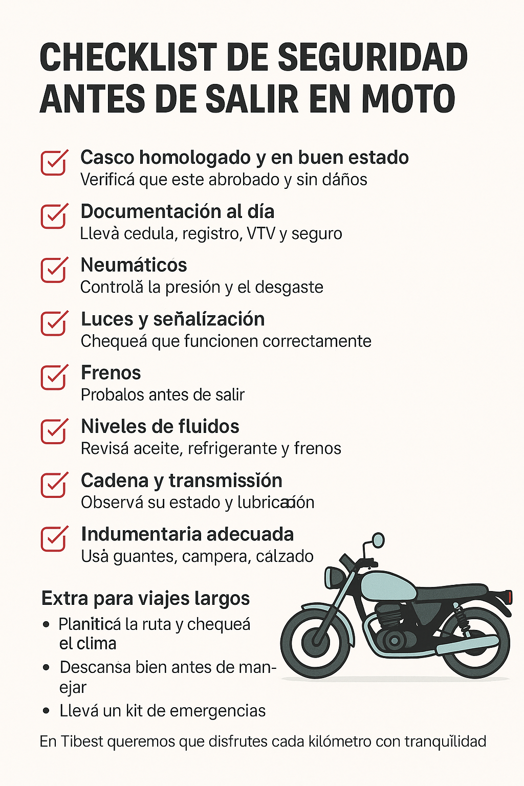 Salir en moto siempre es una experiencia de libertad y adrenalina. Pero esa sensación solo se disfruta al máximo cuando lo hacemos con seguridad. Antes de ponerte al casco y acelerar, hay una serie de controles simples que pueden marcar la diferencia entre un viaje placentero y un imprevisto en el camino.